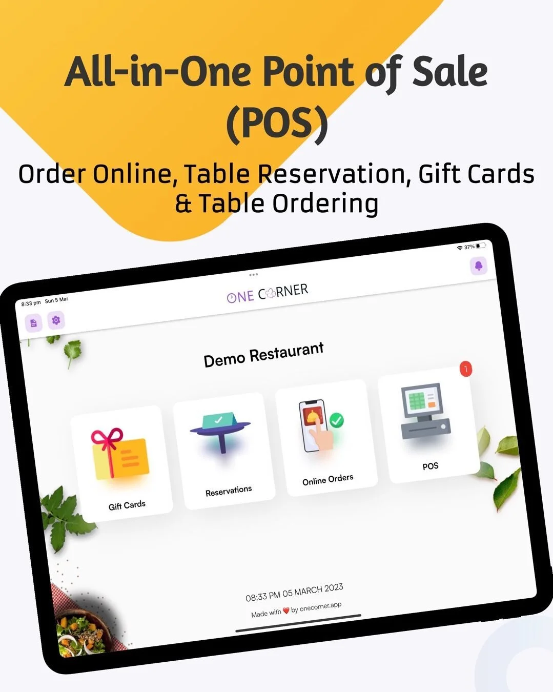 View fullsize Introducing One Corner POS. Everything that your business needs in a single app. Online Orders, Table Reservations, Gift Vouchers and Table Ordering.